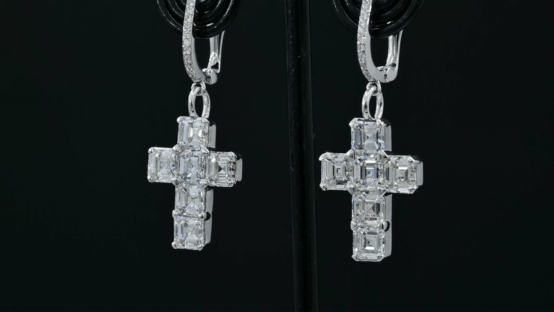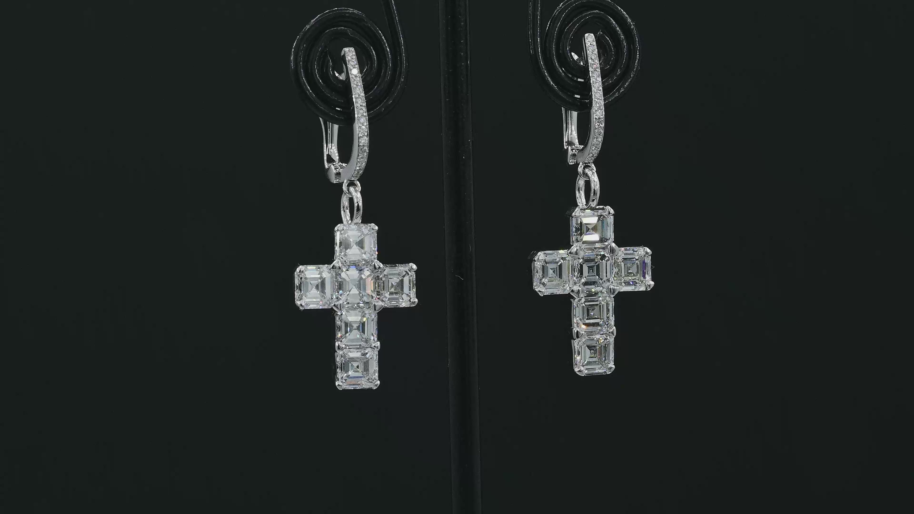 These drop earrings feature cross-shaped designs composed of precisely matched Asscher-cut diamonds, creating a bold yet balanced silhouette. The step-cut facets produce crisp flashes of light and a clean, architectural look, emphasizing symmetry and depth rather than excess sparkle.