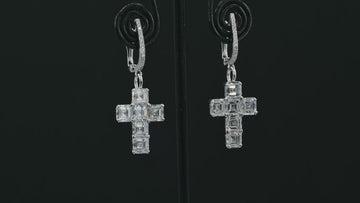 Each cross is suspended from a diamond-accented curved drop, allowing subtle movement while maintaining a refined profile. The polished white metal setting keeps the focus on the geometry of the stones, giving the earrings a structured, modern presence.