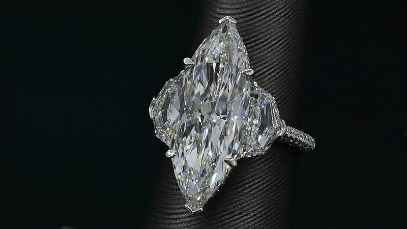 This ring is all drama. A long marquise-cut center diamond stretches across the finger, flanked by matching marquise side stones that create a bold, almost wing-like silhouette. Every facet throws back light, so the whole top of the ring reads as one seamless field of fire.