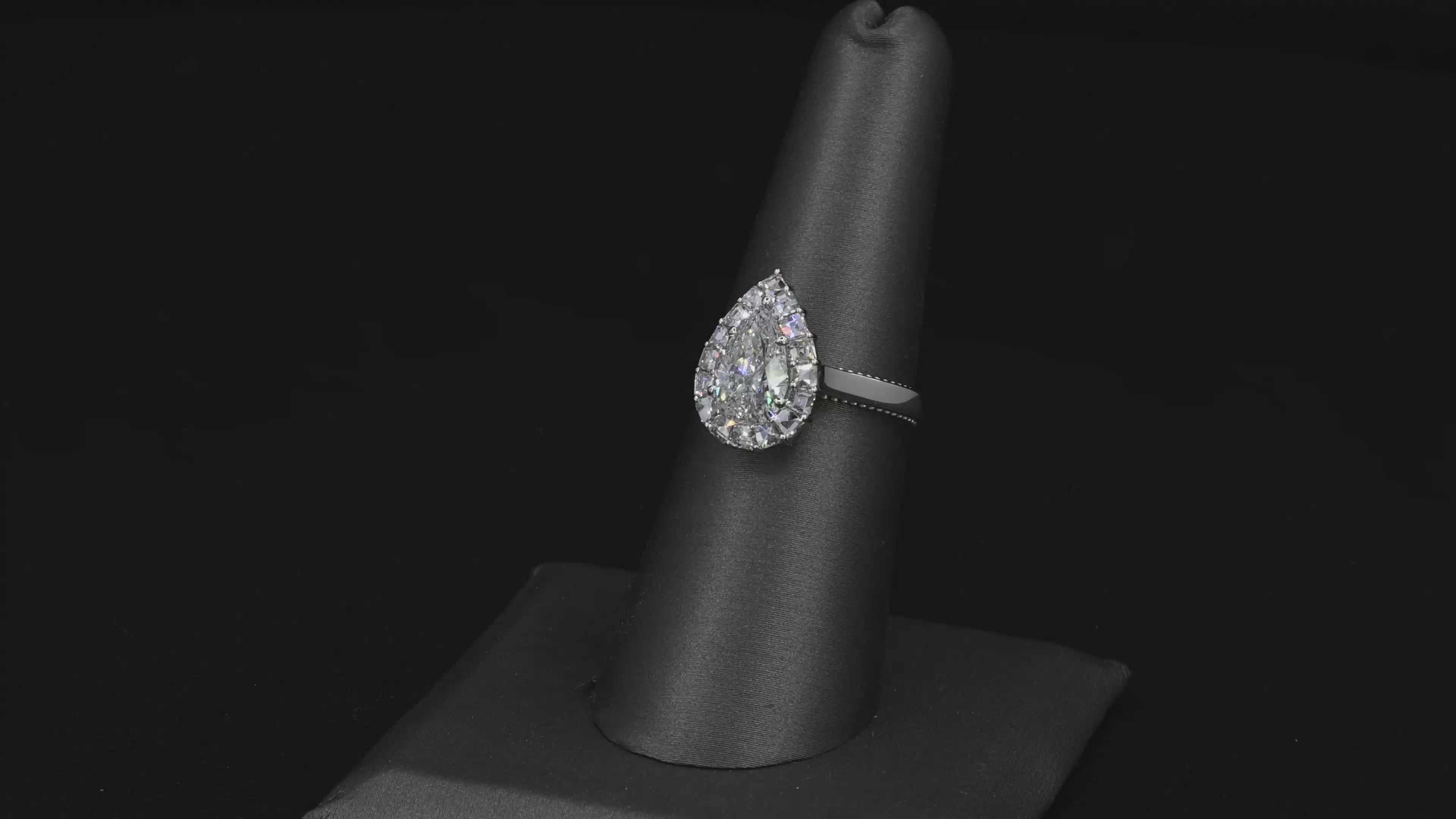 This ring takes the elegance of a pear shape and turns it into a full field of sparkle. At the center, a pear-shaped cluster of carefully matched diamonds forms a single, bright teardrop of light. A slim, high-polish band keeps the silhouette clean, so all attention stays on the elongated shape and the way it catches and reflects every movement.